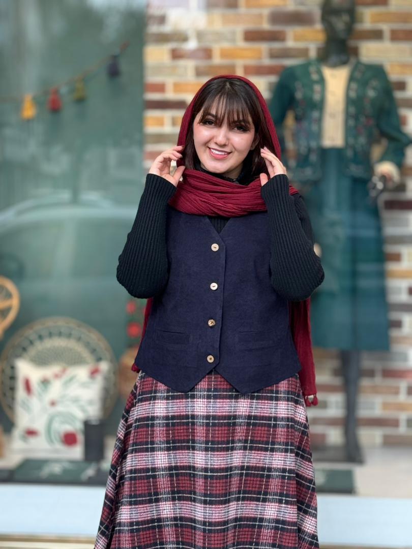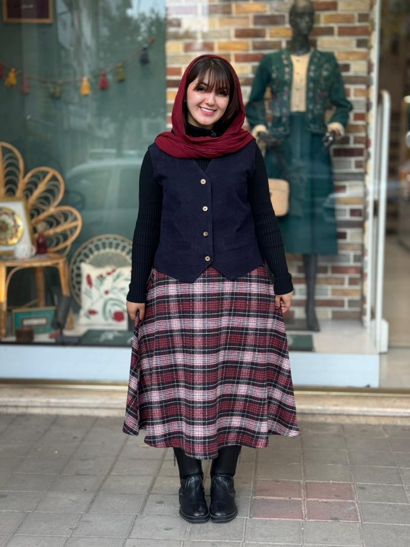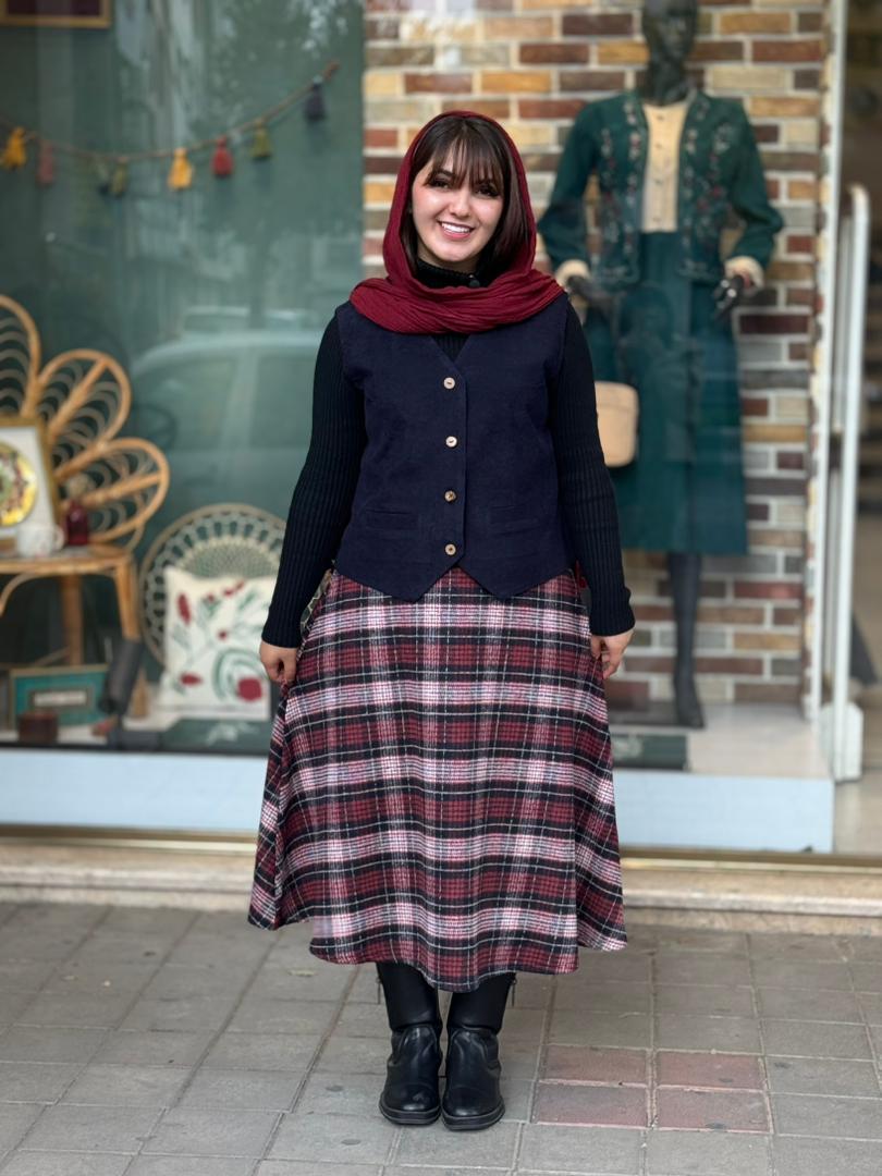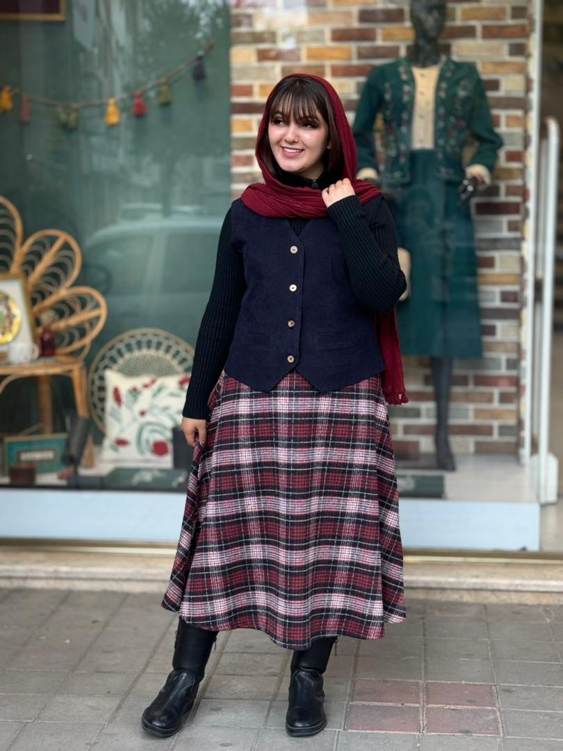 ست جلیقه دامن آذر سورمه ای زرشکی چهارخونه