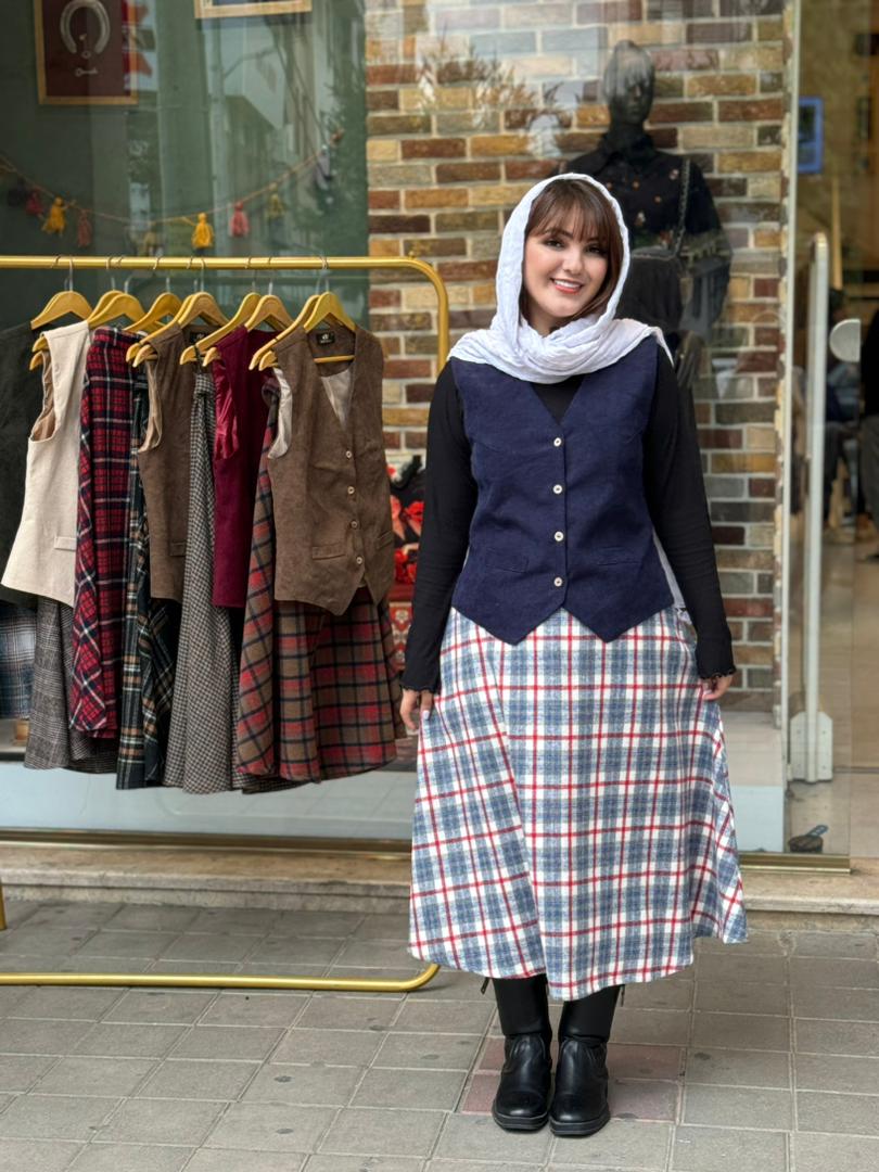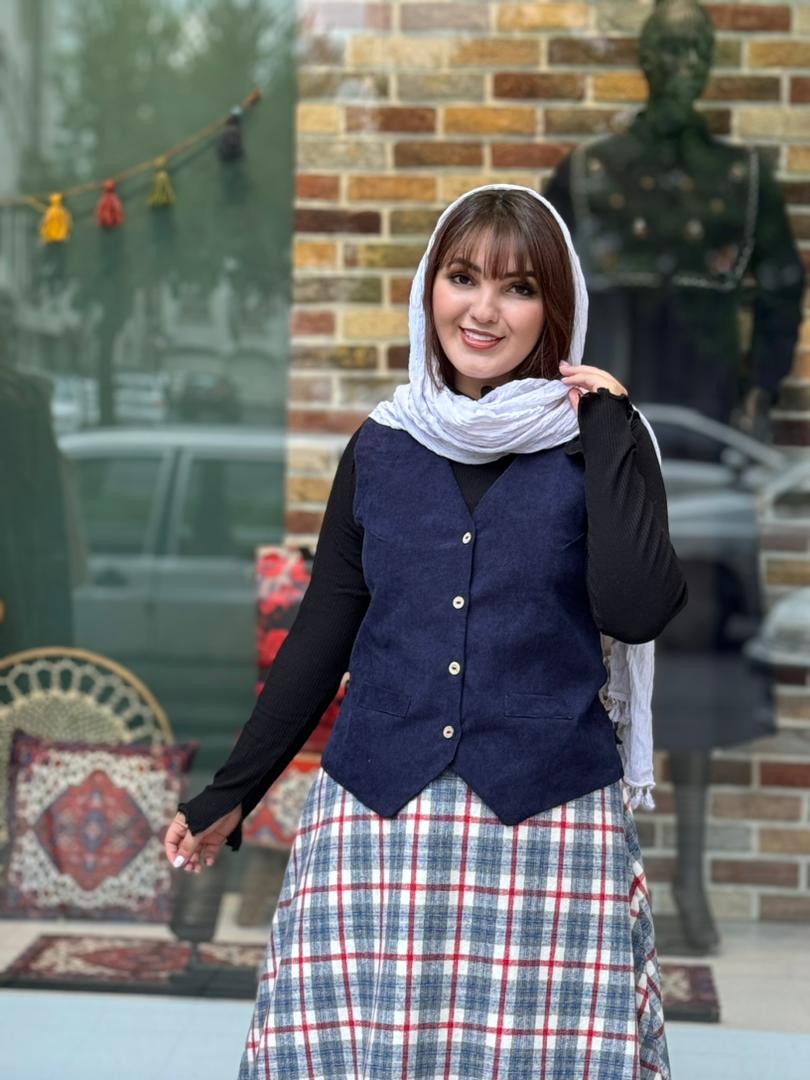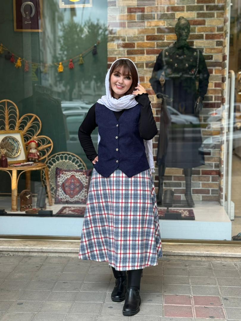ست جلیقه دامن آذر چهارخونه سورمه ای سفید