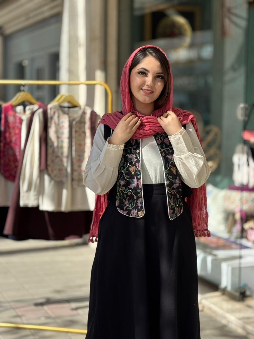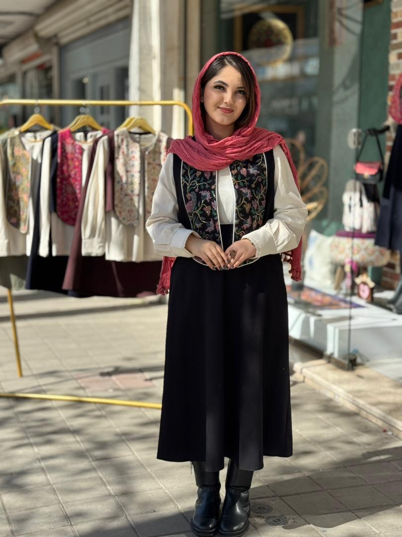 قد جلیقه (قسمت بلند) 49 و (قسمت کوتاه) 43/قد شومیز 65/قد آستین شومیز 60/قد دامن 83