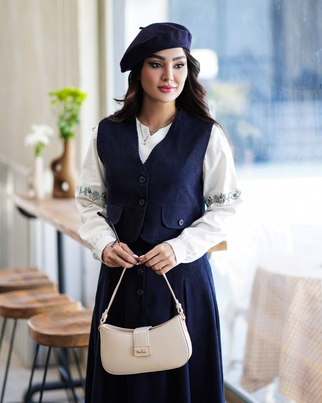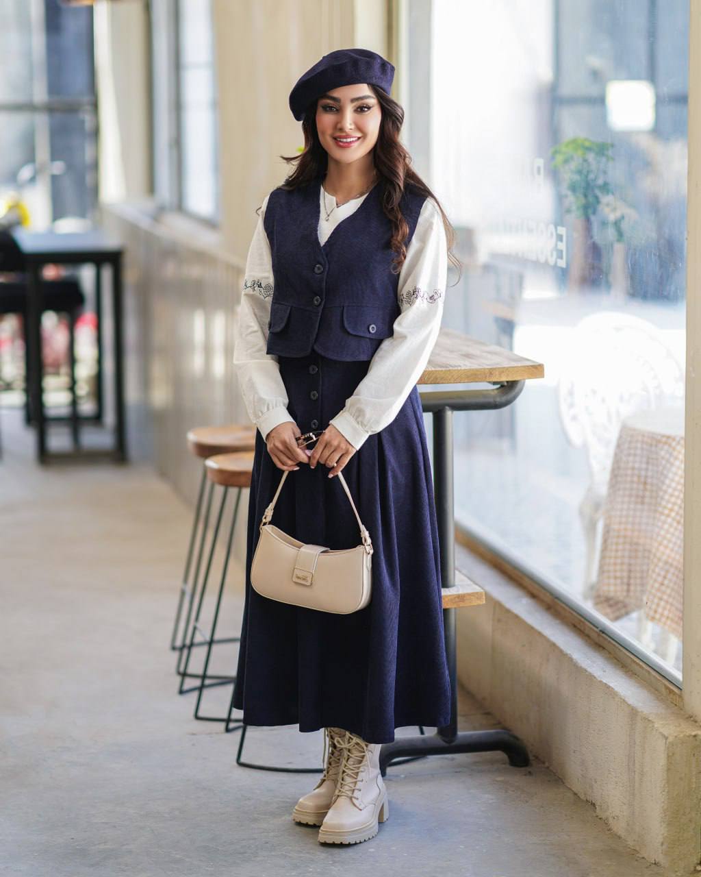 جنس جلیقه و دامن:مخمل کبریتی/جنس شومیز:لینن