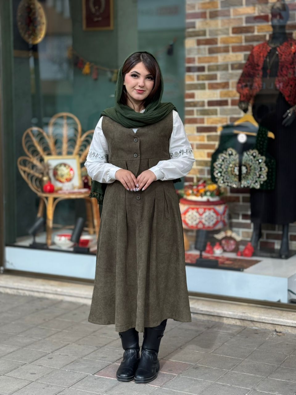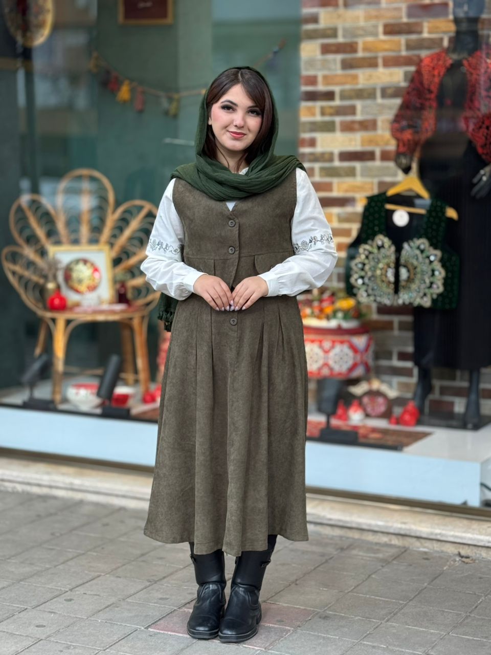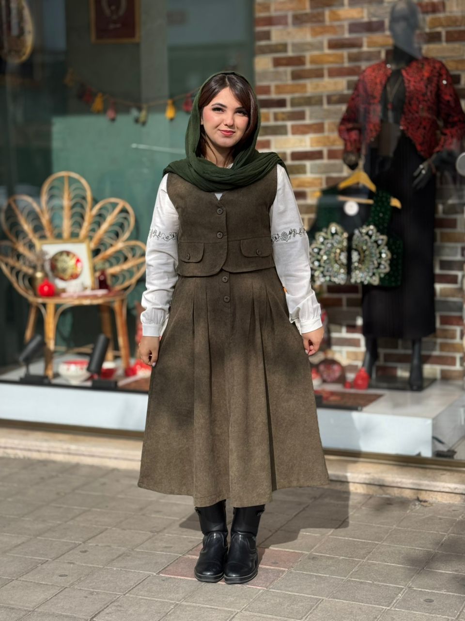 جنس جلیقه و دامن:مخمل کبریتی/جنس شومیز:لینن