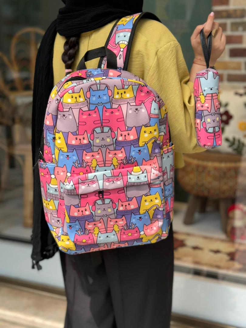 ست کوله پشتی و جامدادی گربه رنگی رنگی تیره