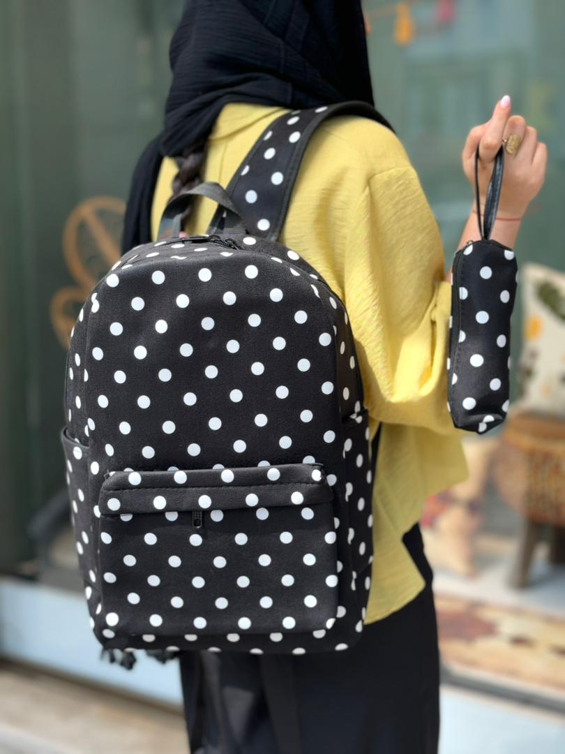 ست کوله پشتی و جا مدادی خال خالی مشکی سفید
