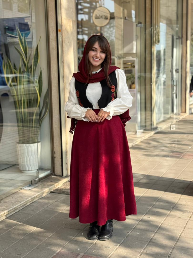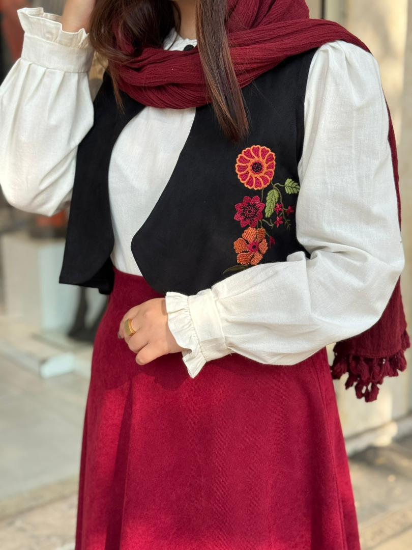 • جنس شومیز:لینن/جنس دامن:مخمل کبریتی/جنس جلیقه:سوییت