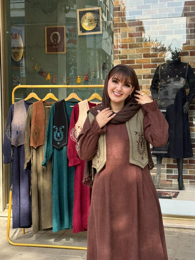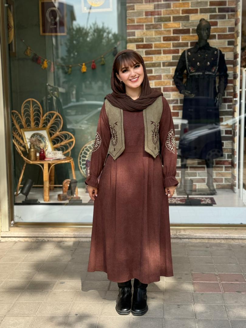 پیراهن جلیقه بته جقه کبریتی قهوه ای یشمی
