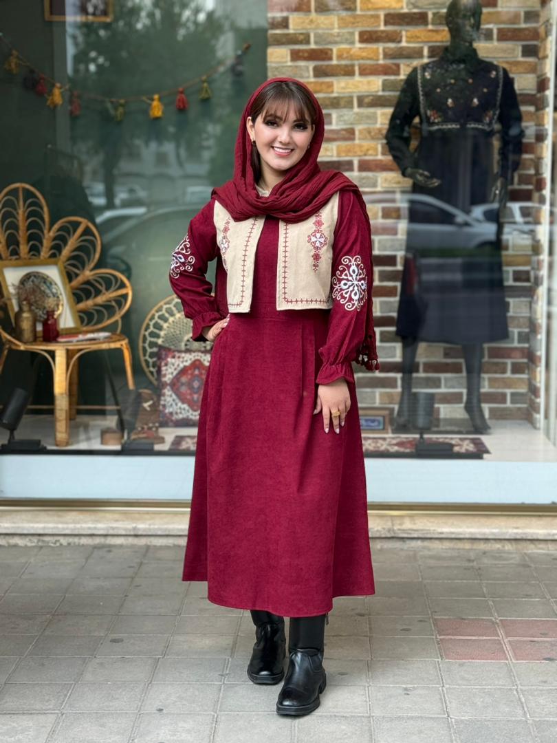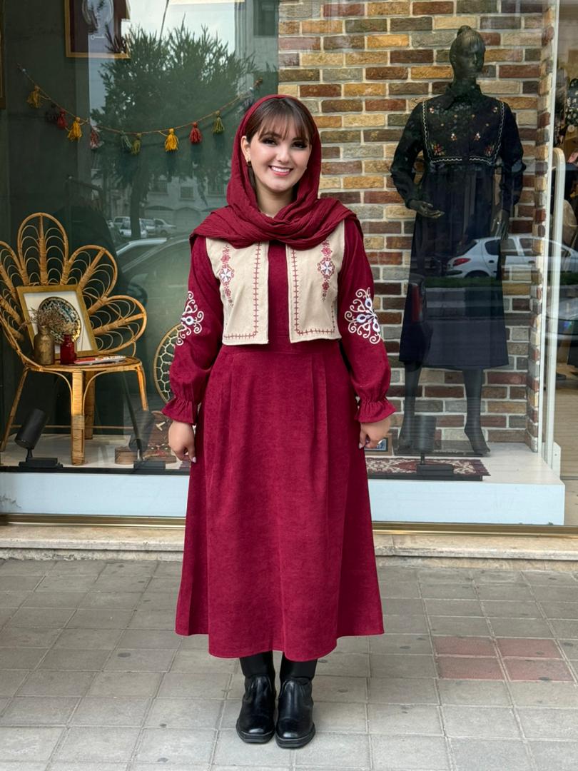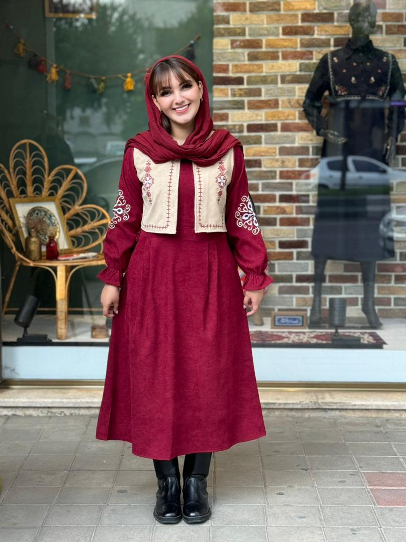 پیراهن جلیقه ترنم کبریتی زرشکی کرم