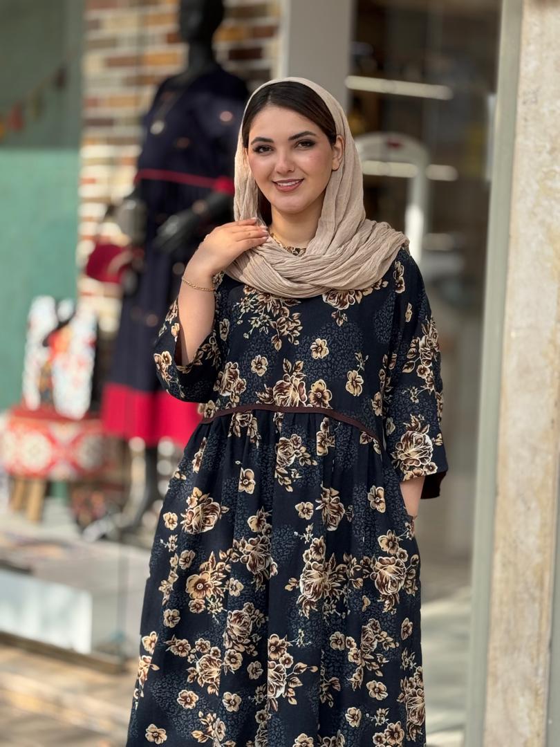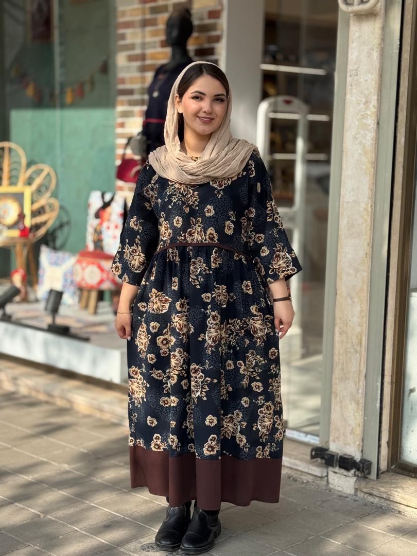 پیراهن نرگس سورمه ای گل درشت قهوه ای