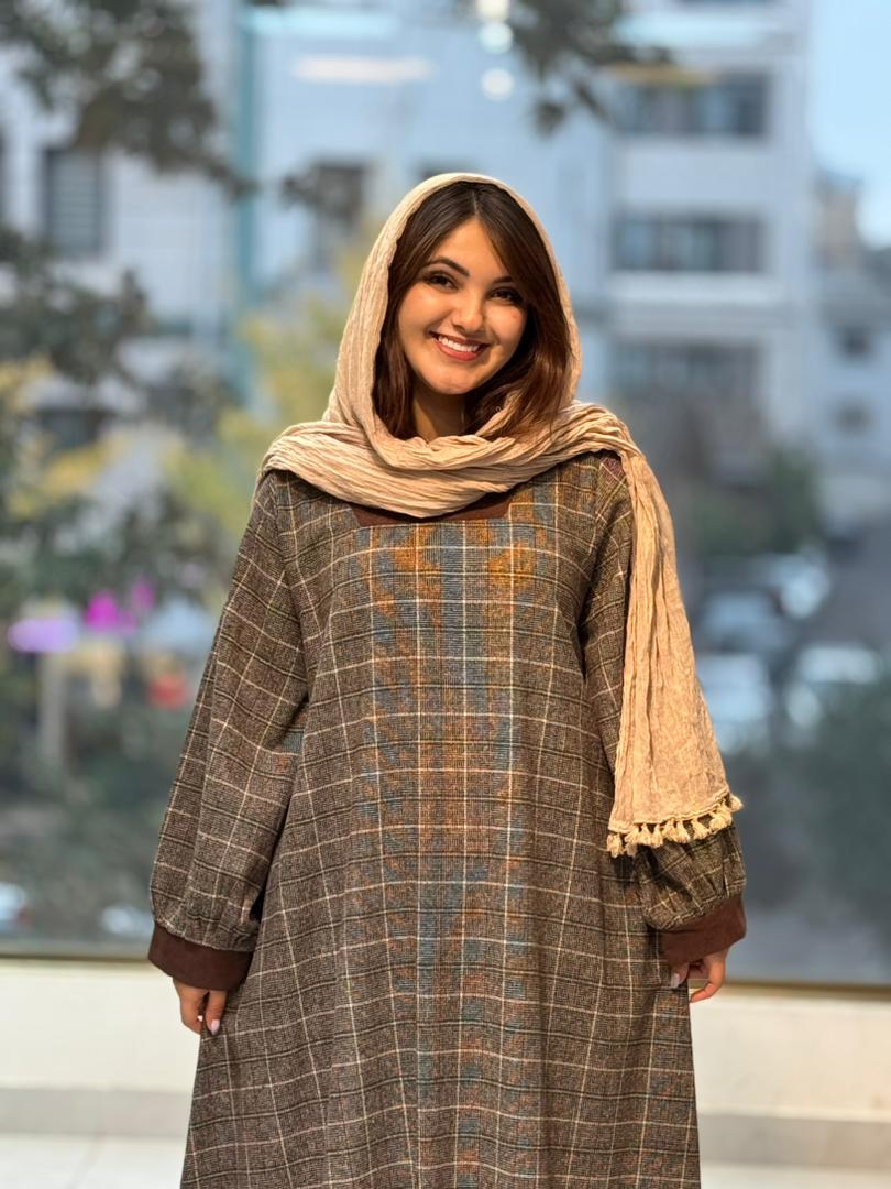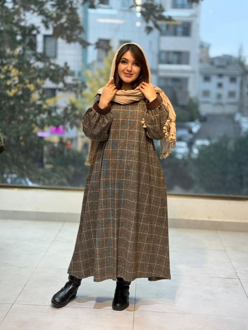 پیراهن هدیه کرم قهوه ای چهارخونه