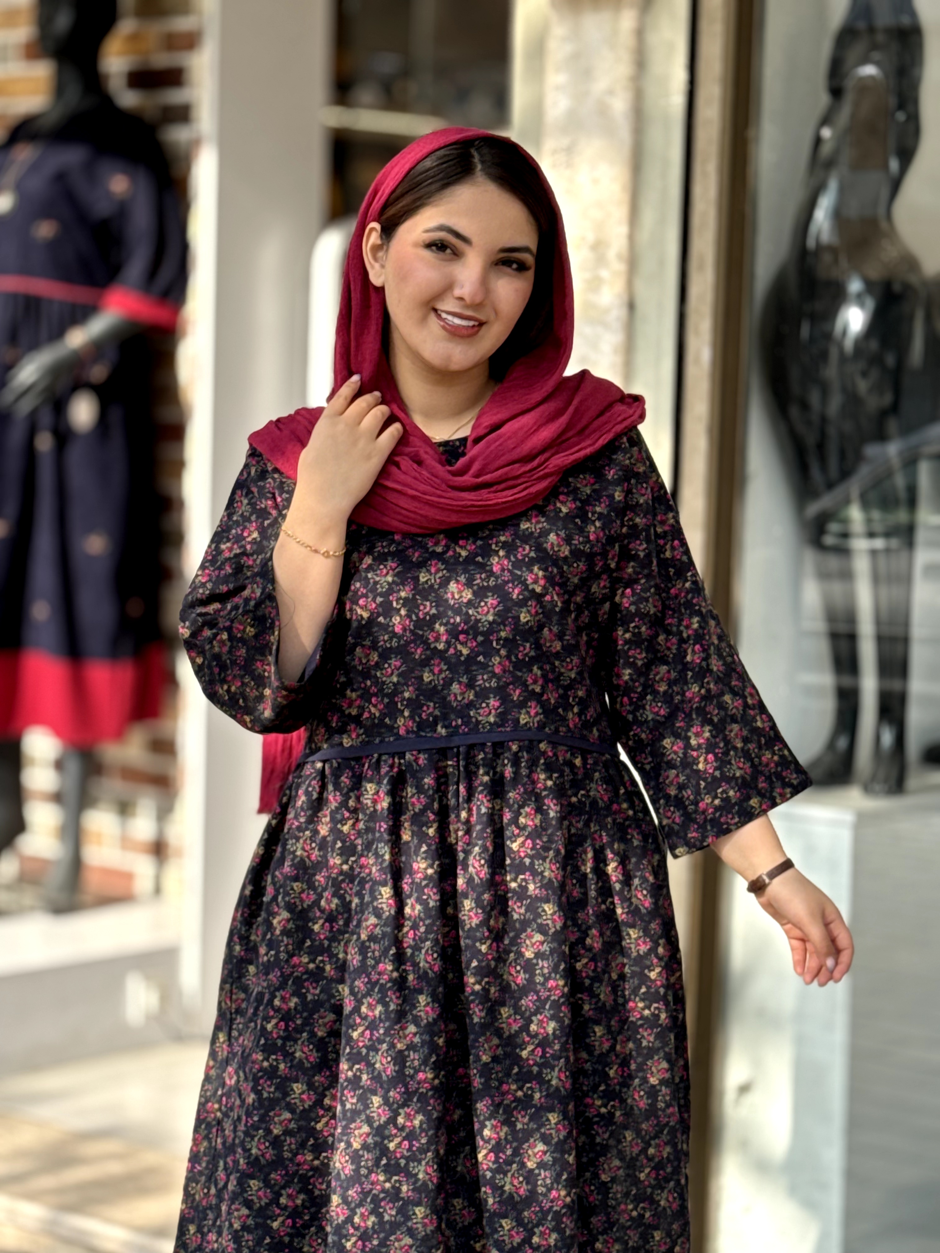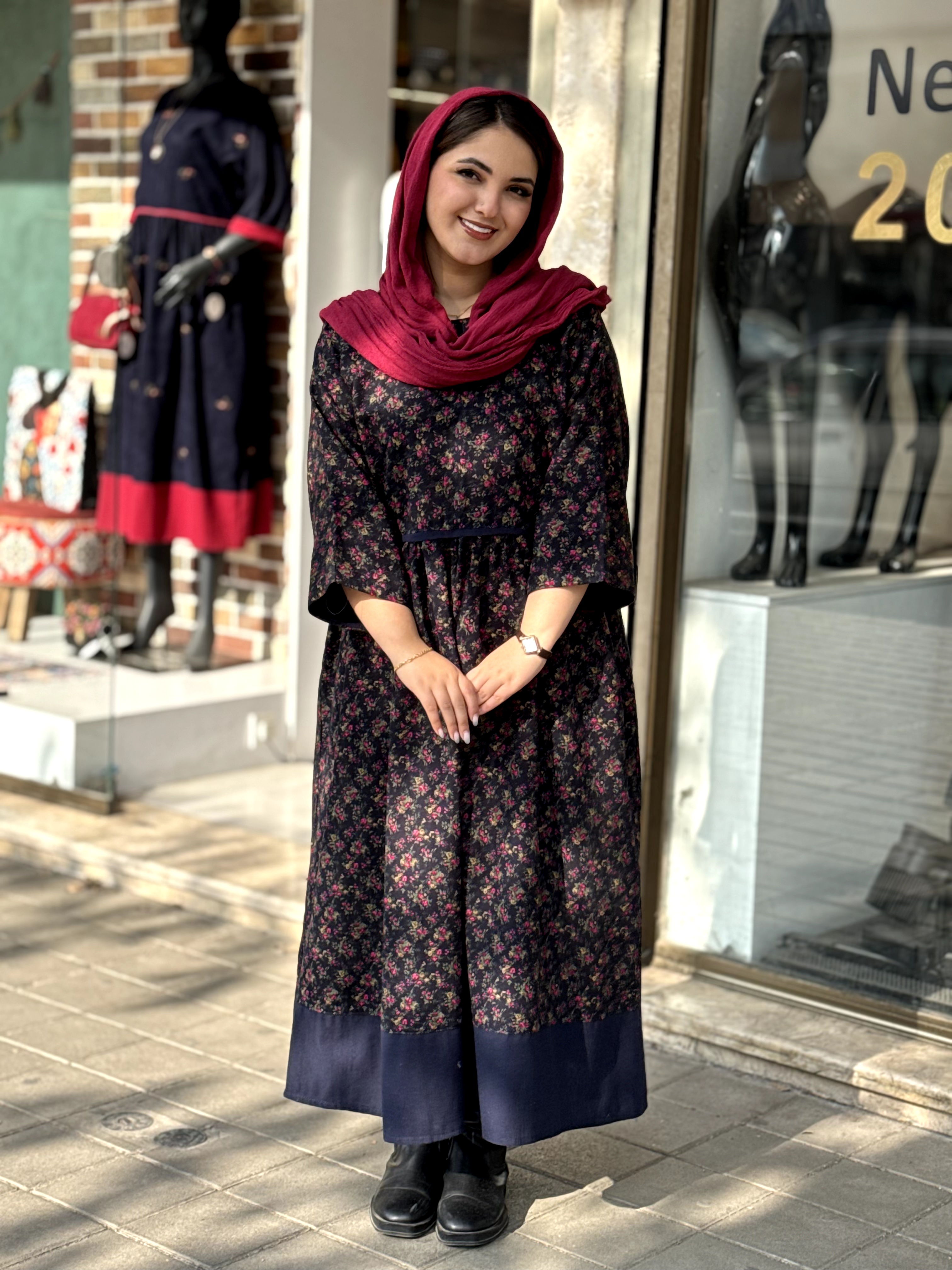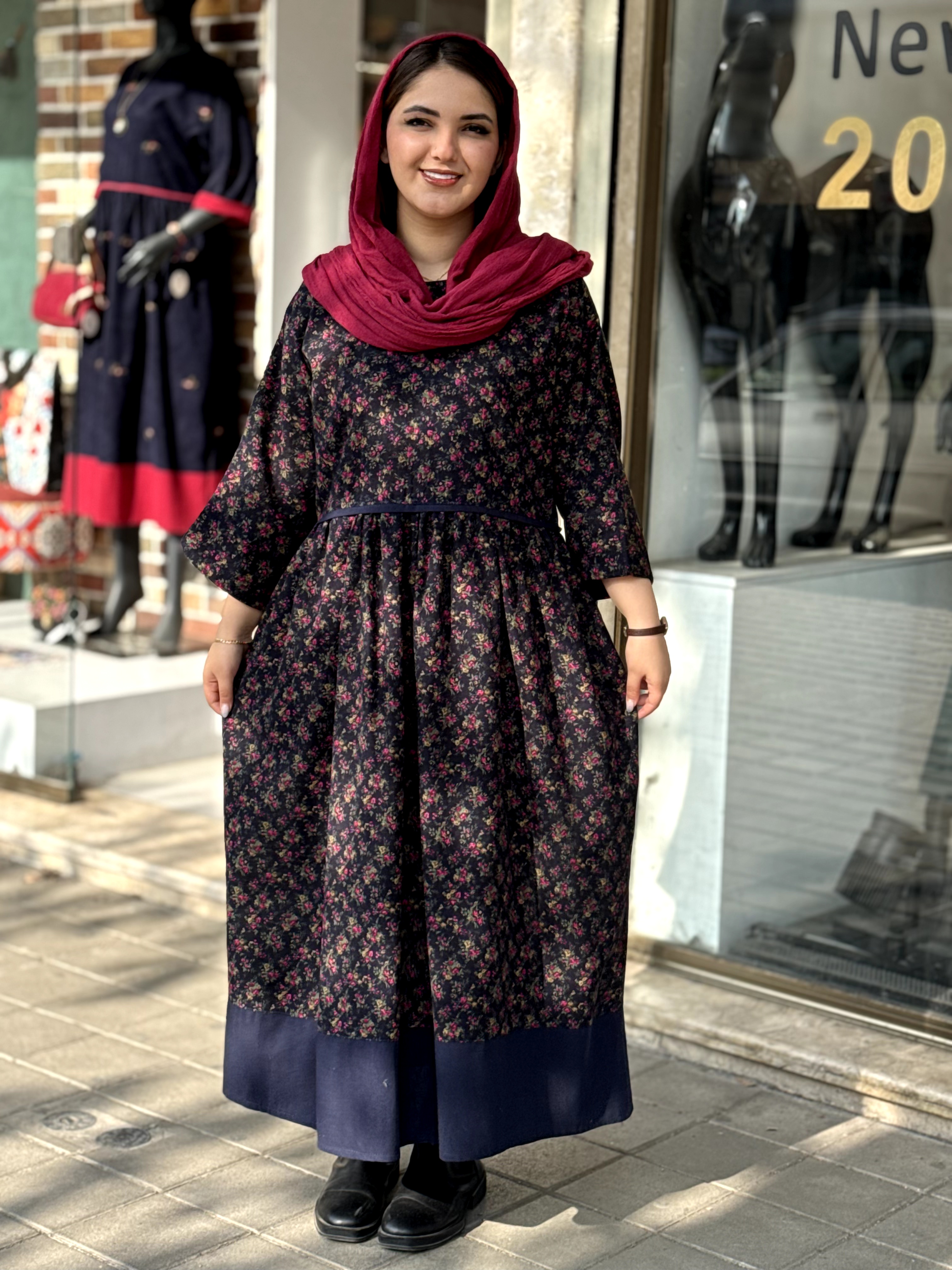 پیراهن نرگس سورمه ای گل ریز سرخابی